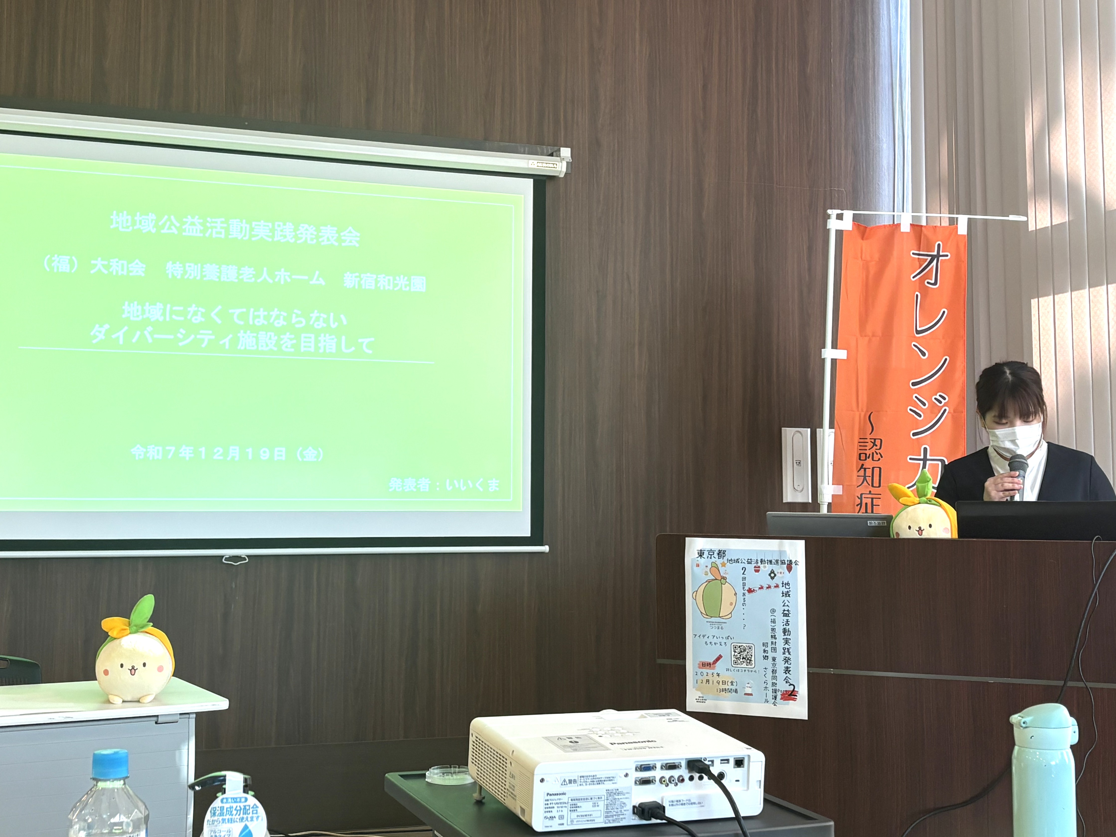 新宿和光園で介護職員兼ボランティアコーディネーターを務める職員から、大和会で実践している地域公益活動とその目的・目標について発表いたしました。